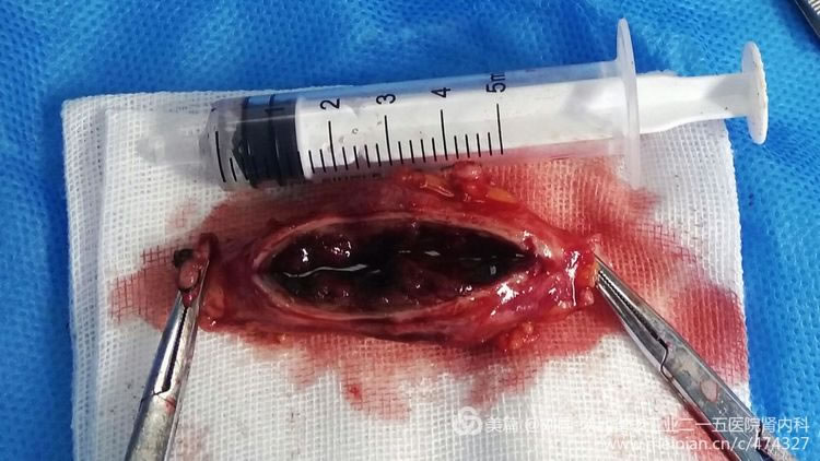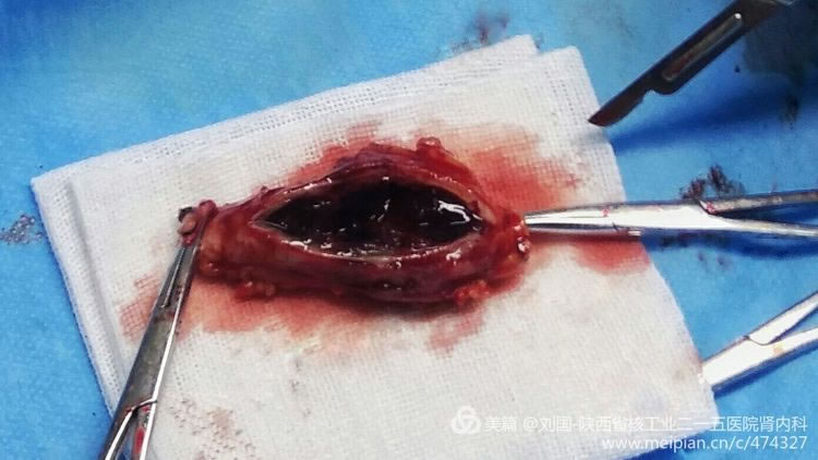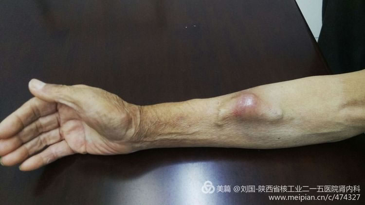 He is hospitalized this time for internal arteriovenous fistula’s cephalic vein tumor-like expansion and thrombegenesis appears in his right forearm, which blocks his cephalic vein from his orificium fistulae to elbow. After his internal fistular was blocked, he performed the internal arteriovenous fistular operation in Xi’an Hospital. When he came to our hospital, the catheterization hemodialysis in his right jugular vein was being executed, part of his right forearm’s orificium fistulae was swelling with severe pain, and his internal thrombus had been organized, which brought much organized thrombus in the cephalic vein from orificium fistulae to elbow without obvious lacuna.