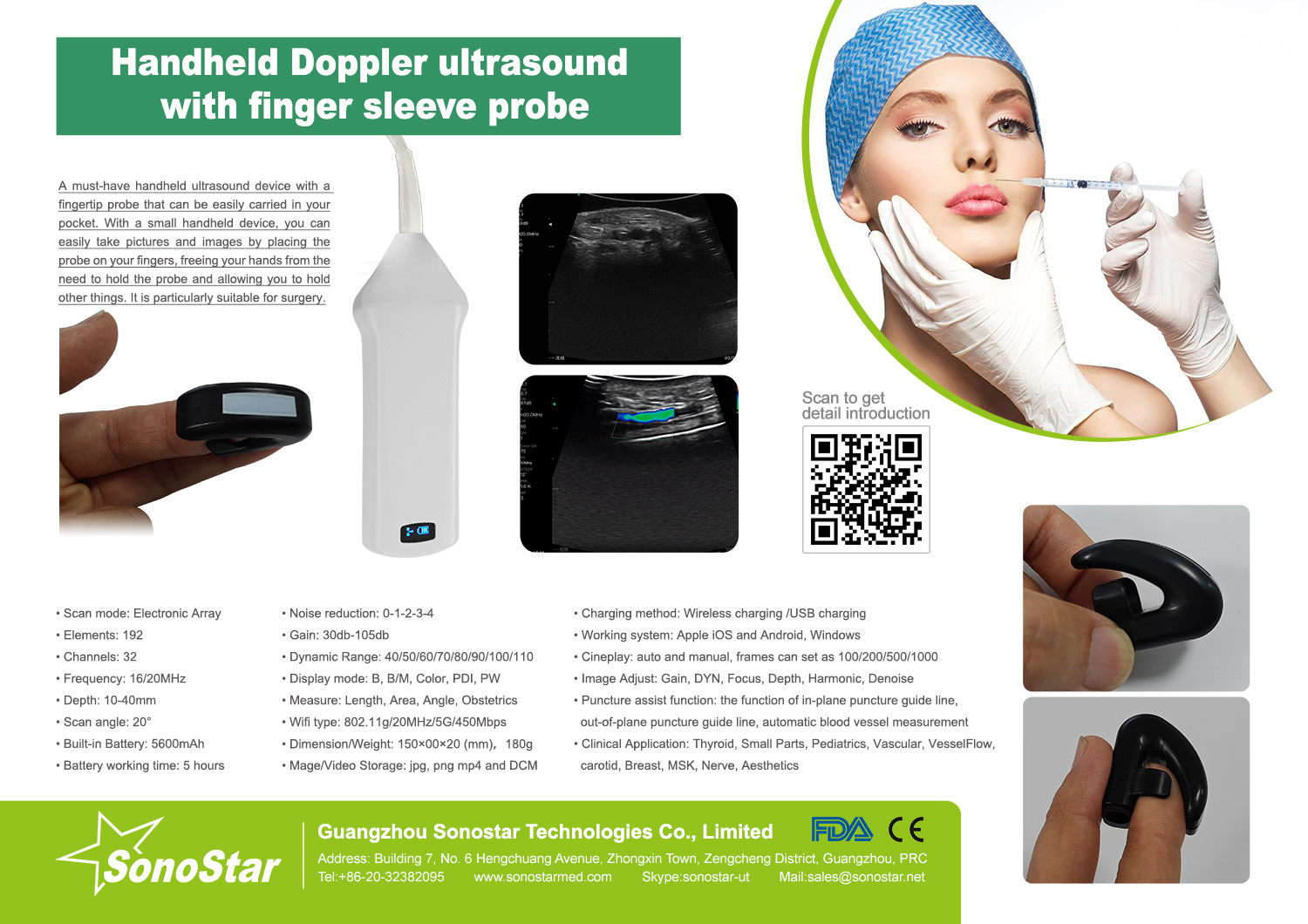 • Puncture Auxiliary Function: In-Plane puncture guide, Out-Plane puncture guide, automatic vascular measurement function