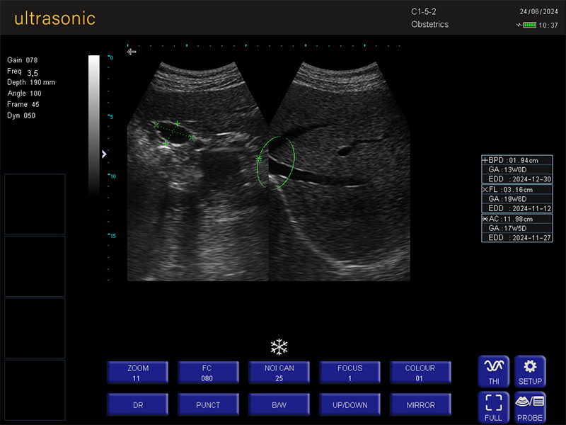 d) Obstetric: 43 measurements including gestational sac, double parietal diameter, head circumference, abdominal circumference, femur length, fibula length, head buttock diameter, yolk sac, abdomen, large and small brain, last menstruation, amniotic fluid, gestational age, expected date of delivery, fetal weight etc,With different ethnic measurement formulas