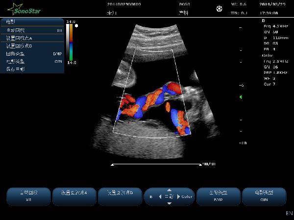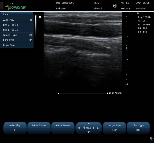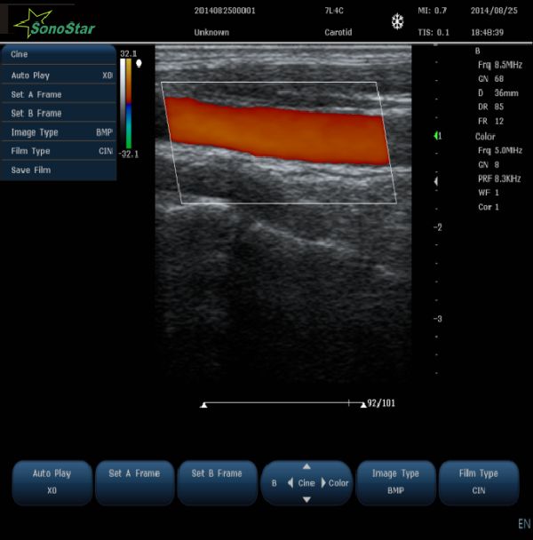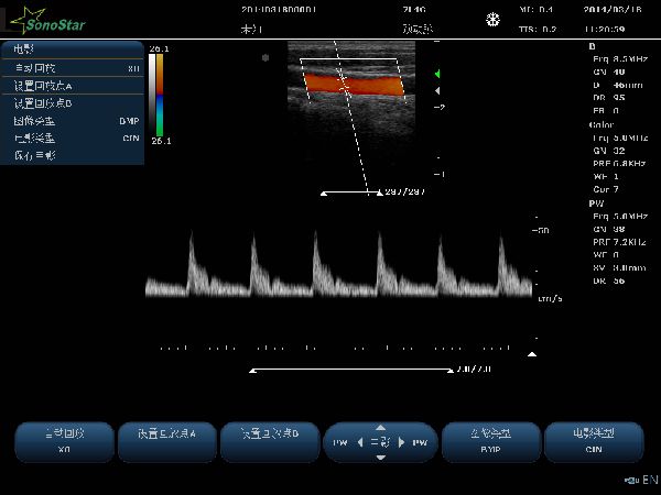 Pre-processing:8-segment TGC adjustment, Dynamic range (0-100), Frame correlation (0-7), Edge enhancement (0-7), Line density (High/Mid/Low)