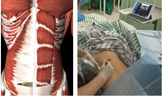 图1 腹壁主管感觉神经分布在腹横筋膜表面,使用便携式超声可以轻松的将局麻药液注射在腹横筋膜表面,也即