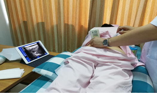 图2 住院医师考核操作,便携式超声保证了患者的安全