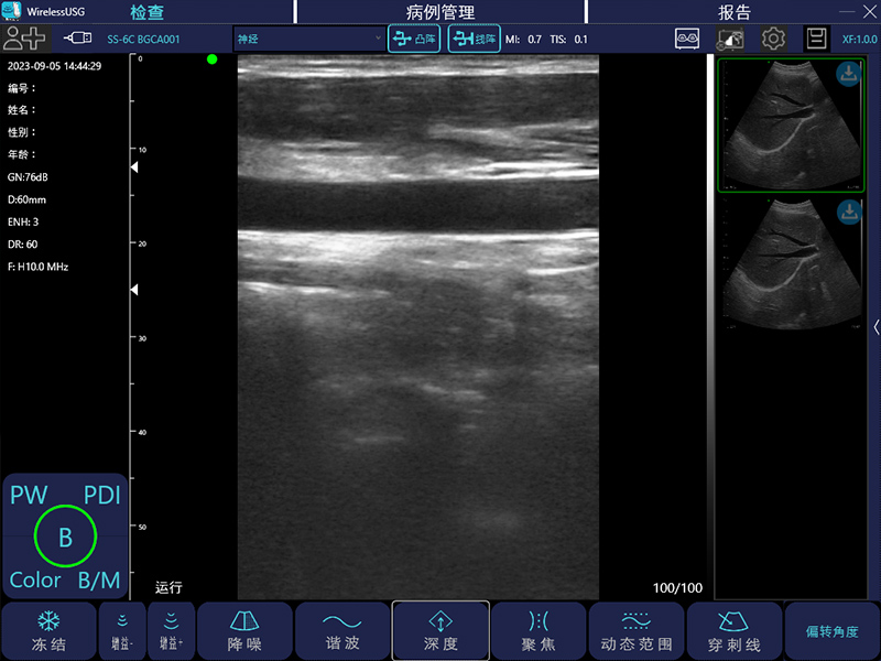 - 图像调节:黑白图像增益、分段增益TGC、动态范围、焦点、深度、反相脉冲谐波、降噪、彩色增益、血流采样框大小、PRF