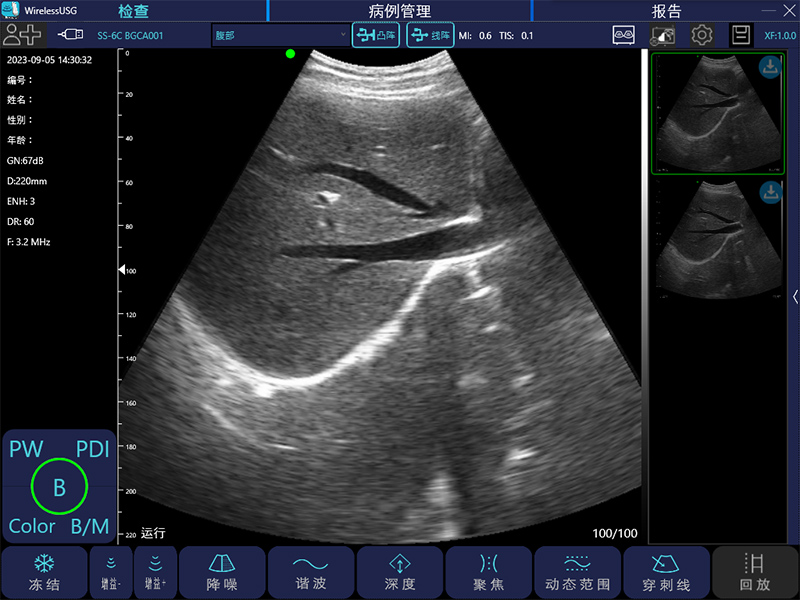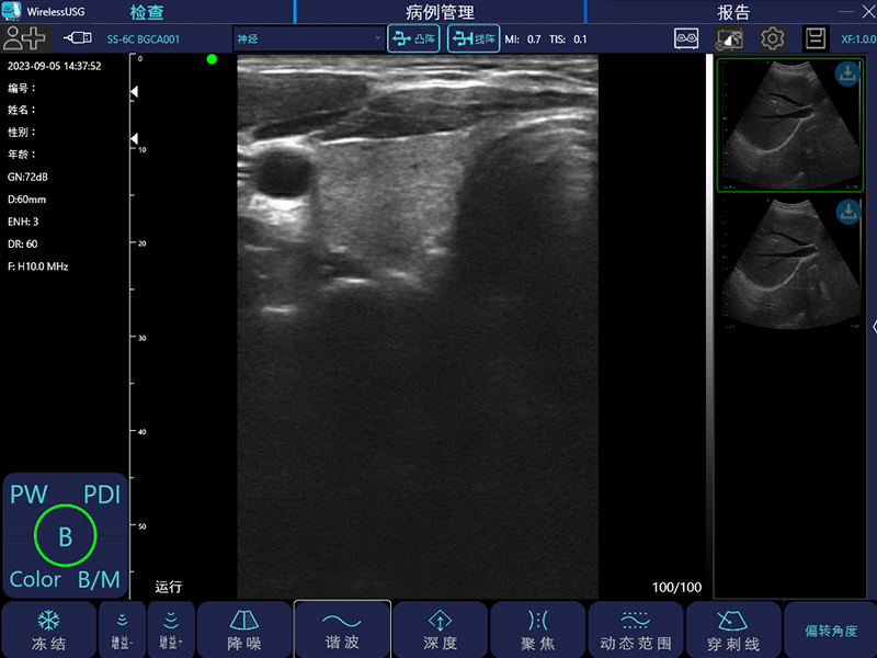 - 图像调节:黑白图像增益、分段增益TGC、动态范围、焦点、深度、反相脉冲谐波、降噪、彩色增益、血流采样框大小、PRF