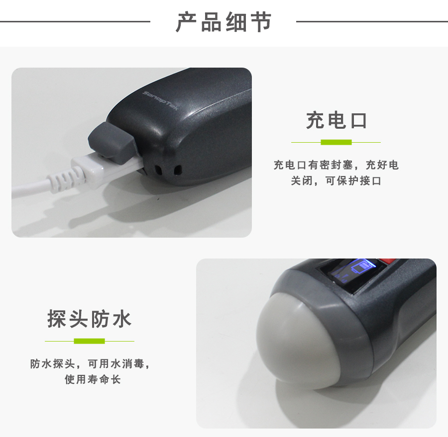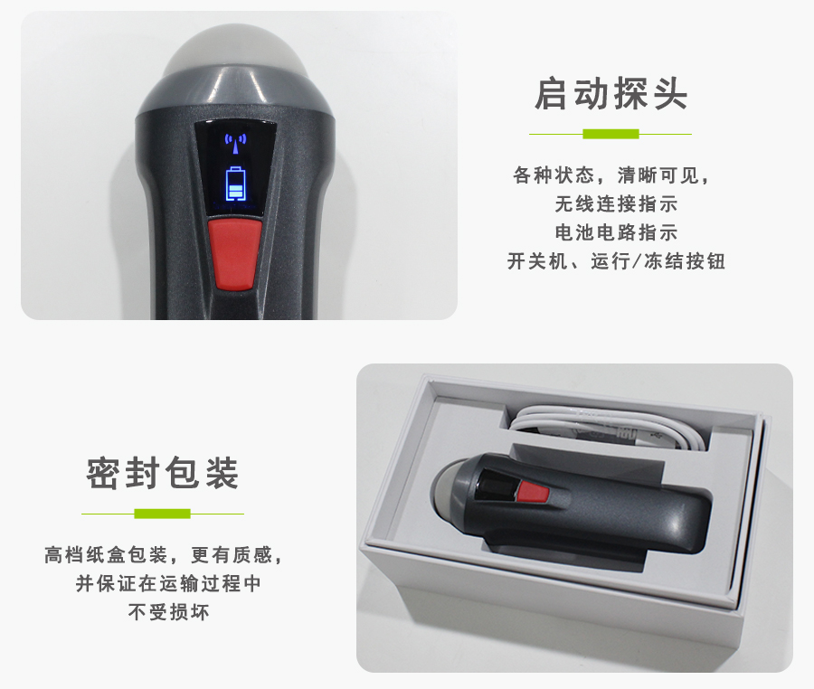 产品配置 主机(探头)、内置电池、USB充电线缆、腕带、ipad防水袋等