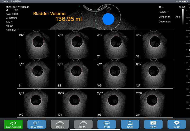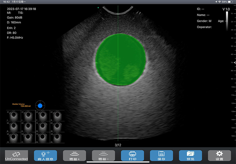 - 先进的计测算法、强大的膀胱壁识别技术、准确的勾边技术,以及高精确度的探头,使得扫查计测结果准确度更高:其中全新算法,计测结果不受膀胱形状、大小影响,使用时无需考虑和选择性别、年龄段,也无需考虑子宫切除等特殊情况对膀胱形状的影响,对不同膀胱兼容性更好,不会发生检测小容积膀胱、特殊形状膀胱时计测结果误差很大的现象,且使用操作也更加方便;而采用AI等技术,对膀胱壁识别更加准确,包括对附着有空气的膀胱壁识别率也比较高,即使膀胱未蓄满尿液时,也能准确计测出尿量,另外AI功能还可对膀胱壁有特异不好勾边的,把异常图拿到训练集里训练,即可解决勾边困难问题