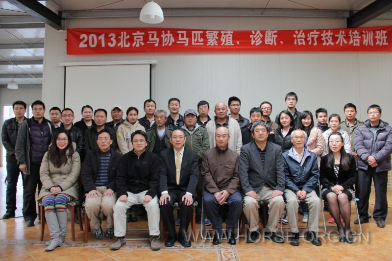 2013年4月10日北京马术运动协会在克来务养殖公司举办了为期一天的“马匹繁殖、诊断、治疗技术专题培训班”。培训班特邀日本赛马国际交流与轻种马登录协会一行6位专家前来进行理论讲解和实践演示。来自天星调良、京华兴、东兴赛马场、中牧工商、克来务、天精地华、科兴马业、内蒙鄂温克旗马业协会以及中国农业大学的近40位北京马术俱乐部、外省市马术协会、养殖公司的兽医及孕育相关的人员参加了本次培训班。